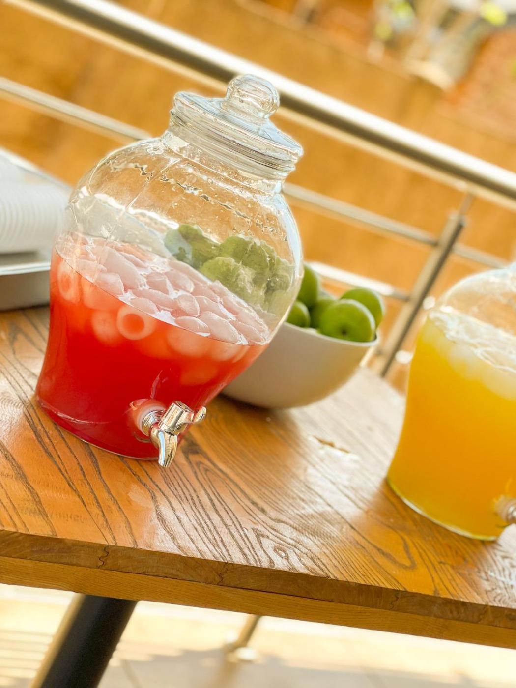 A selection of options including fresh pastries, fruits and juice is served for the continental breakfast.