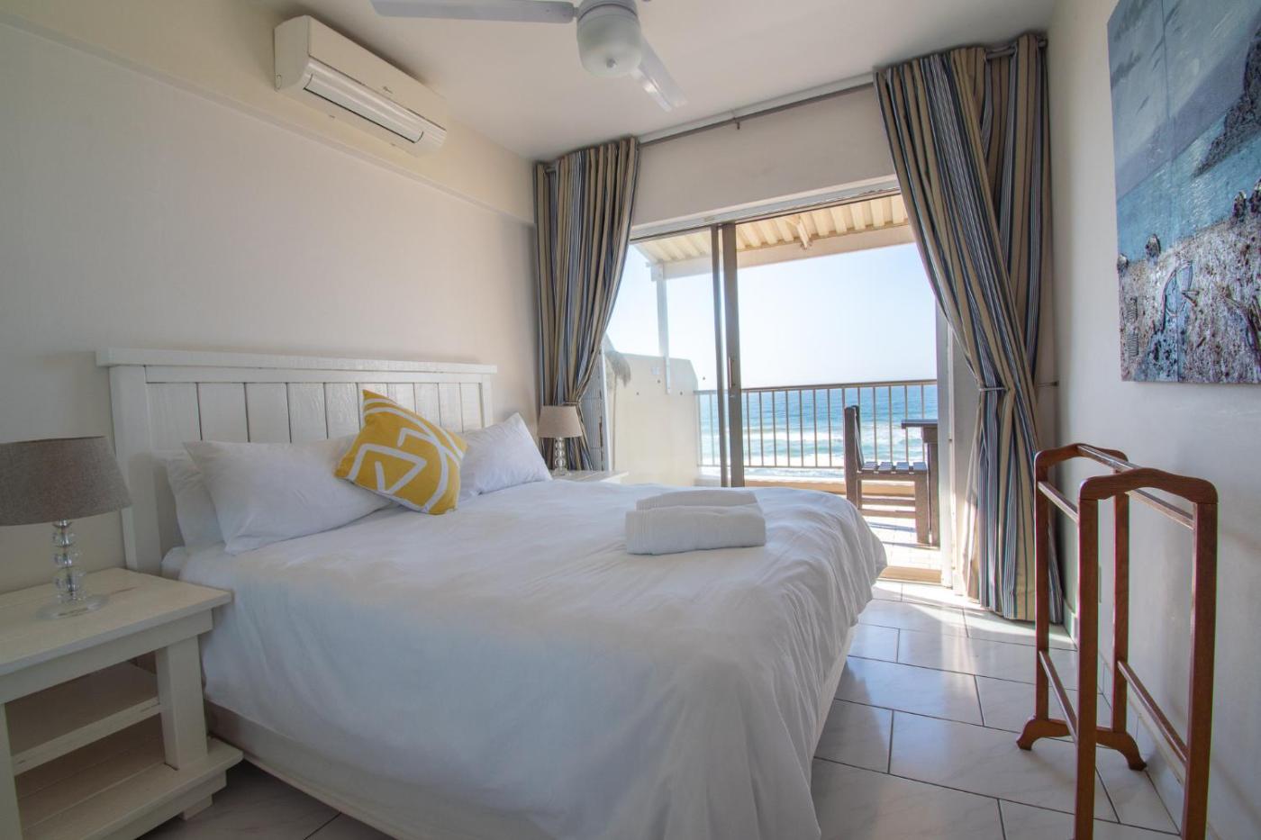 Two-Bedroom Apartment. The sea-views from this apartment are superb. The popular promenade, the sand and surf areright in front of you. The open plan kitchen, dining room and lounge lead onto the large balconyyou can sit and just enjoy relaxing. The main bedroom also opens onto the balcony so it feels as if the sea isaround you. The en-suite has a bath and toilet and the 2nd bedroom shares the guest shower and toilet. The apartment is air-conditioned, has full DSTV and free Wi-Fi.