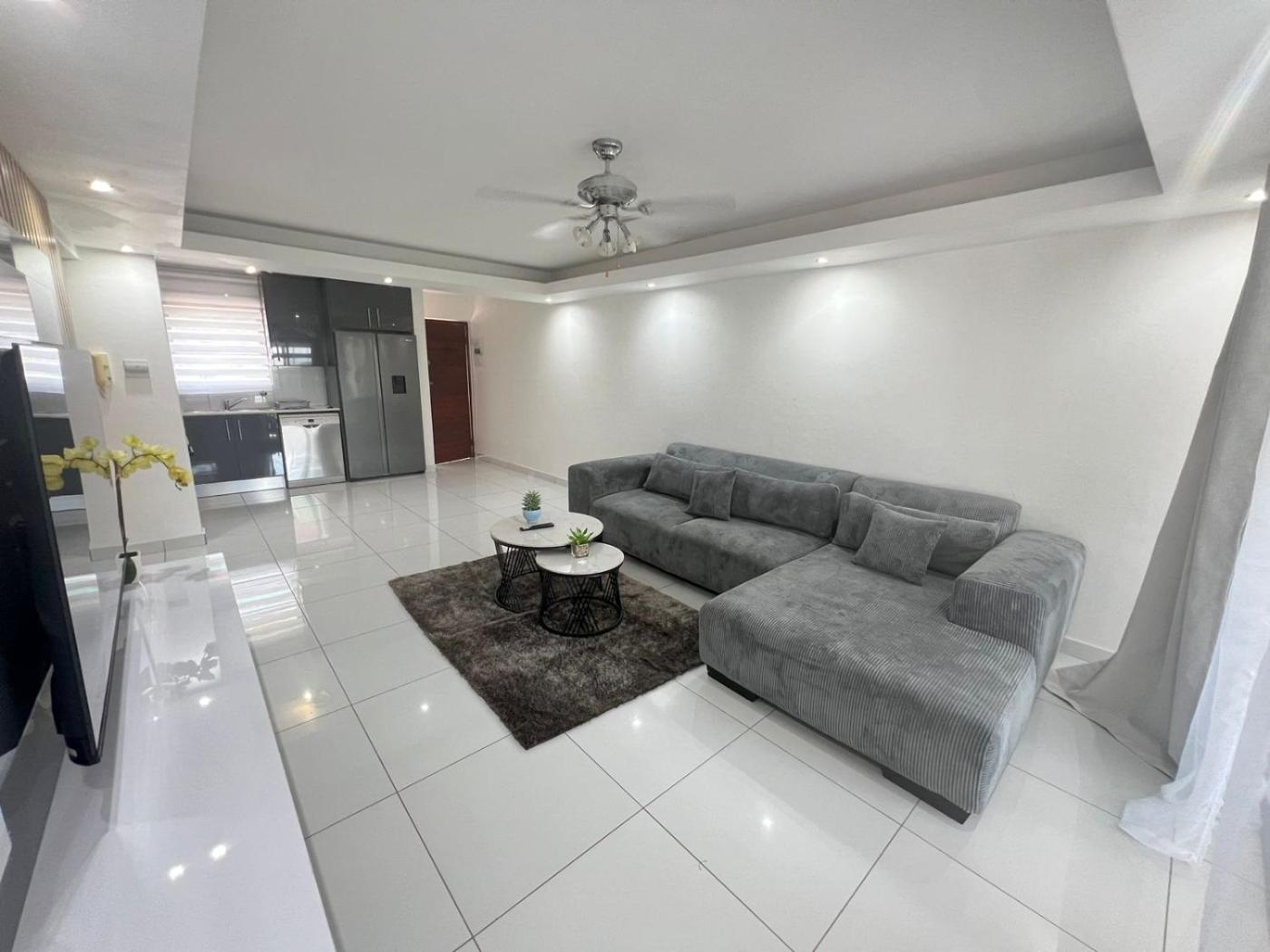 The apartment is composed of 2 bedrooms, a fully equipped kitchen, and 2 bathrooms. A flat-screen TV is featured.