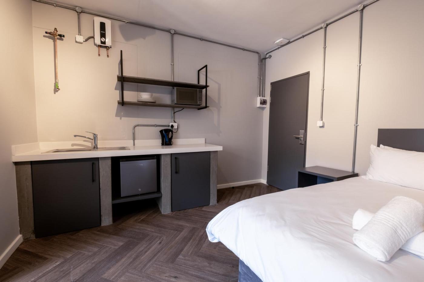 Standard Queen Room. The double room provides an electric kettle, a tiled floor, as well as a private bathroom boasting a walk-in shower. The double rooms kitchenette, which has kitchenware and a microwave, is available for cooking and storing food. The spacious double room features a private entrance, soundproof walls, a minibar, a wardrobe and a flat-screen TV with streaming services. The unit has 1 bed. ;