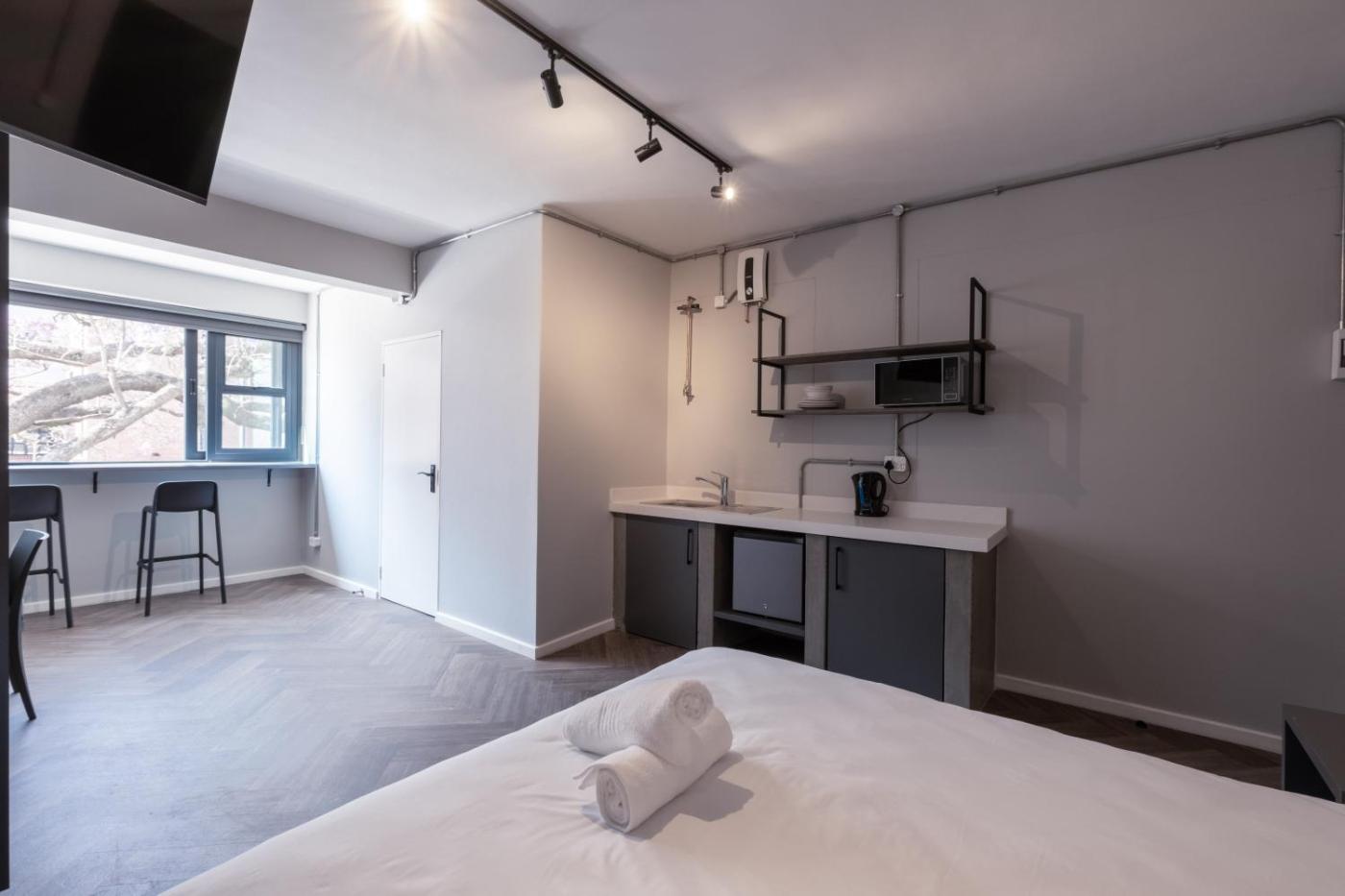 Queen Room with Balcony. The well-equipped kitchenette features kitchenware, a microwave and an electric kettle. The spacious double room offers a private entrance, soundproof walls, a balcony with city views as well as a private bathroom featuring a walk-in shower. The unit offers 1 bed. ;