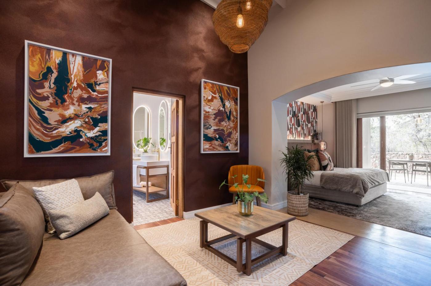 King Room Garden View. Located downstairs and featuring a balcony with views of the forest or bushveld, this air-conditioned suite is decorated with elegant wooden furniture and sober colours. It includes a fully stocked minibar and an LCD TV. ;