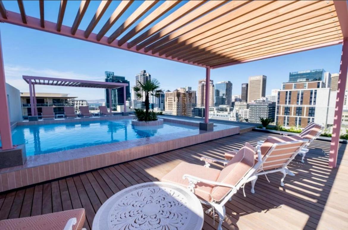 Guests can enjoy the rooftop pool at the apartment.