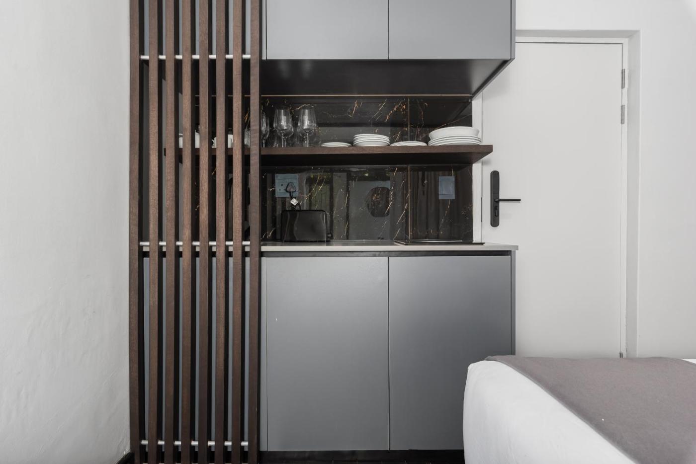 Deluxe Studio. The studio offers an electric kettle, heating, as well as a private bathroom boasting a shower and a hairdryer. In the well-equipped kitchenette, guests will find a stovetop, a refrigerator, kitchenware and a microwave. This studio is air-conditioned and has a TV with streaming services, a private entrance, a wardrobe and a safe deposit box. The unit has 1 bed. ;