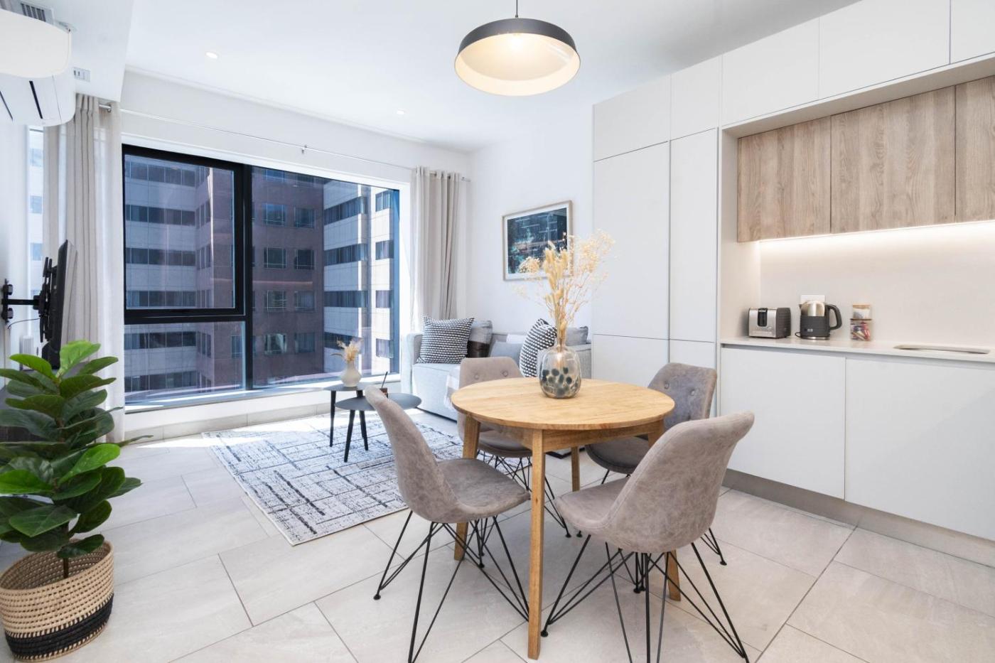 One-Bedroom Apartment. The apartment has 1 bedroom, 1 bathroom and a kitchen. The well-equipped kitchen features a stovetop, a refrigerator, kitchenware and an oven. This apartment features a tea and coffee maker, a TV and city views. The unit has 1 bed.