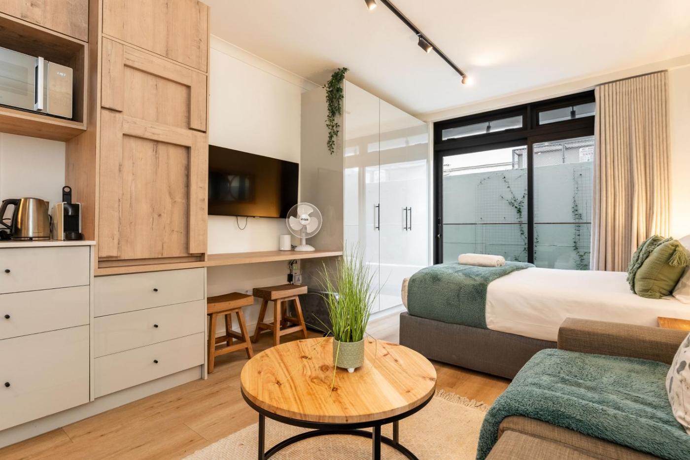 Deluxe Queen Studio. The studio provides a seating area, a wardrobe, as well as a private bathroom featuring a shower and a hairdryer. Guests can make meals in the kitchenette that features a stovetop, a refrigerator, kitchenware and an oven. Boasting a balcony, this studio also features a washing machine, a coffee machine and a TV with streaming services. The unit has 1 bed.