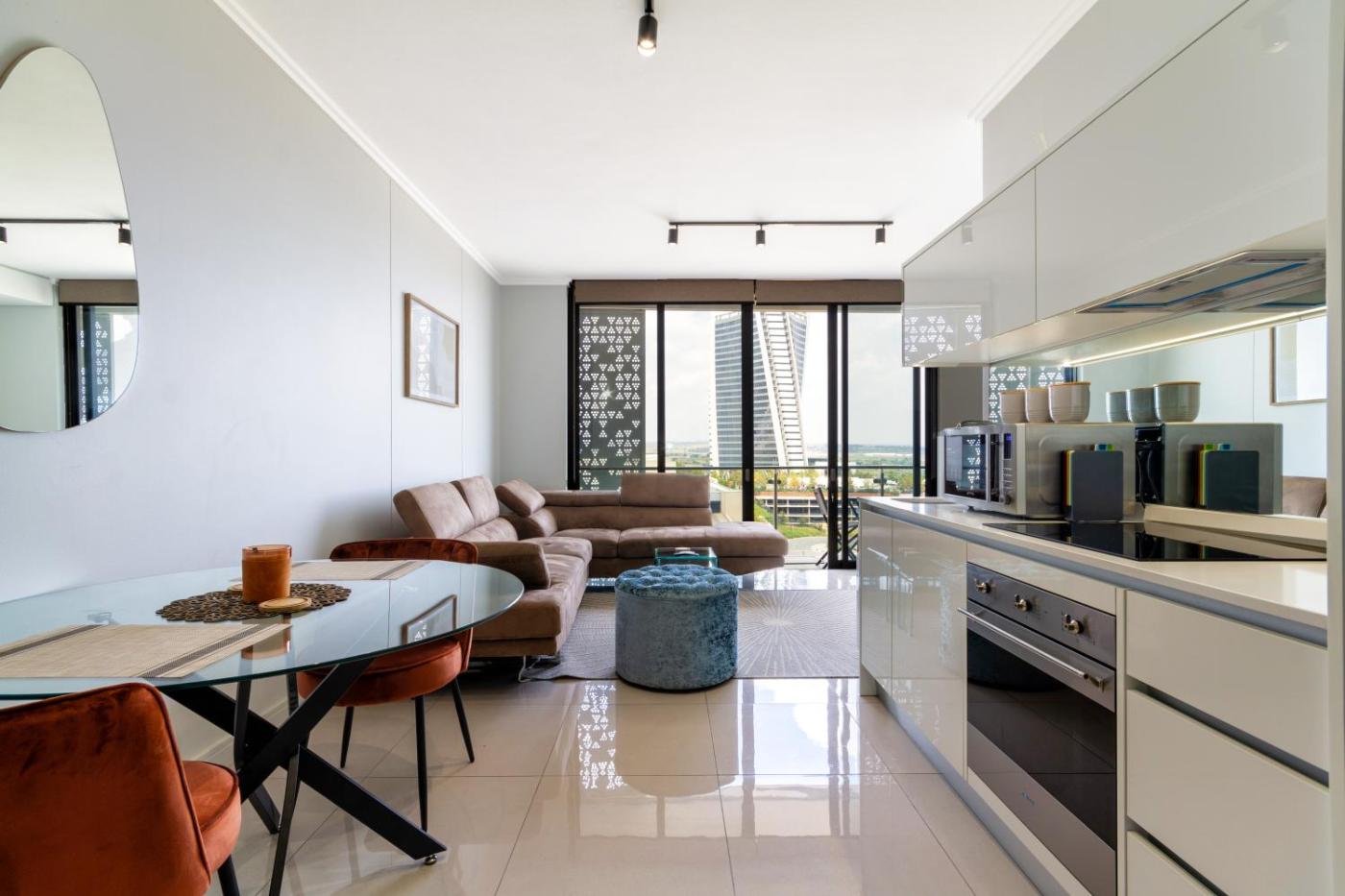 Offering city views, #AlimamaSpaces The Phums Ellipse is an accommodation situated in Midrand, 15 km from Gautrain Sandton Station and 16 km from Sandton City Mall. The air-conditioned accommodation is 4.6 km from Gallagher Convention Centre, and guests can benefit from on-site private parking and complimentary WiFi. The property is non-smoking and is located 13 km from Montecasino.