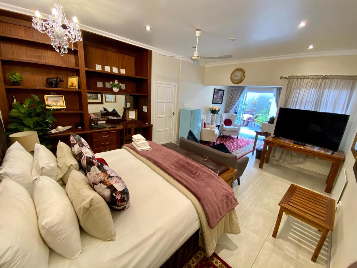 The suites at Waterkloof Guest House feature a seating area, a flat-screen TV, air conditioning and a patio. There is a full a kitchenette with a microwave and an oven. Featuring a spa bath, the private bathrooms also come with a shower. You can enjoy pool and garden view from the room.