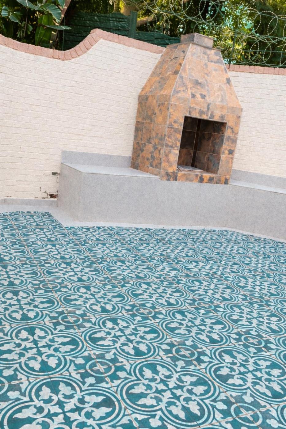The villa features an outdoor fireplace and a picnic area.